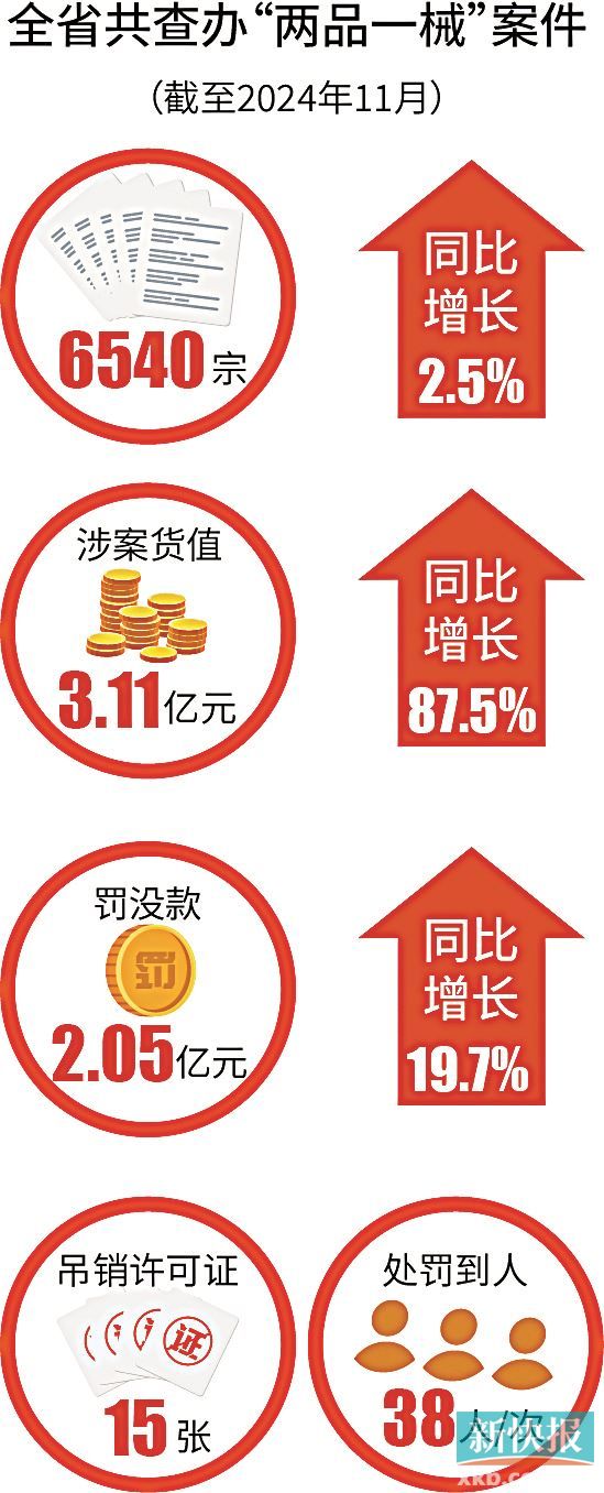 据统计,截至2024年11月,全省共查办“两品一械”案件6540宗,同比增长2.5%,涉案货值3.11亿元,同比增长87.5%,罚没款2.05亿元,同比增长19.7%,吊销许可证15张,处罚到人38人/次。成功查办一批在全国具有影响力的大案要案,保持打击药品违法犯罪的高压态势。