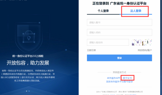 4、进入登录页面后选择:法人登录-数字证书,进行登录系统(如下图示):