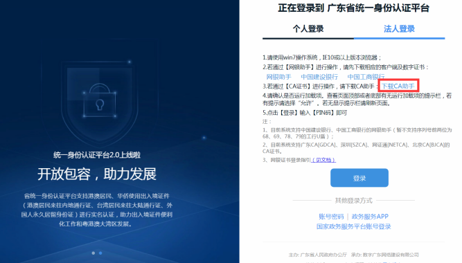 注:第一次登录使用,并请下载安装“CA助手”;电子密匙的初始密码见指引卡片,关于初始密码修改请见“安装使用指南”。